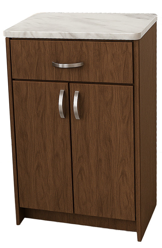 Make a gorgeous first impression with this standing concierge desk. The radius front encourages unobstructed movement throughout your reception area. Includes 1 double-door storage cabinet + 1 storage drawer.