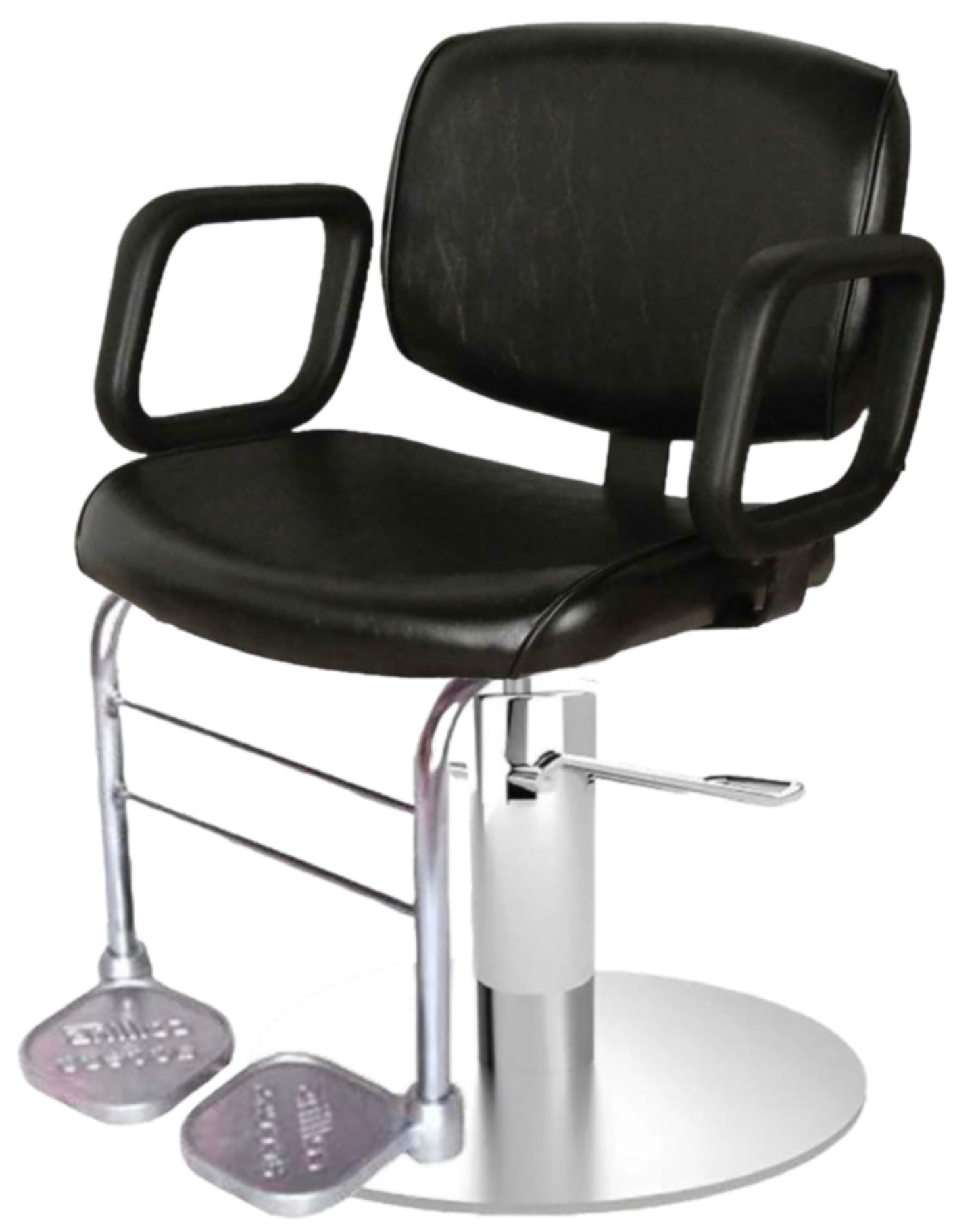 Spectacular upholstery, tasteful steel arms, and impressive comfort are fused together into this striking chair. Many stylists have remarked on the comfort of this chair, with its contoured back supporting the curve of the spine, and how it encourages the client to sit up straighter.