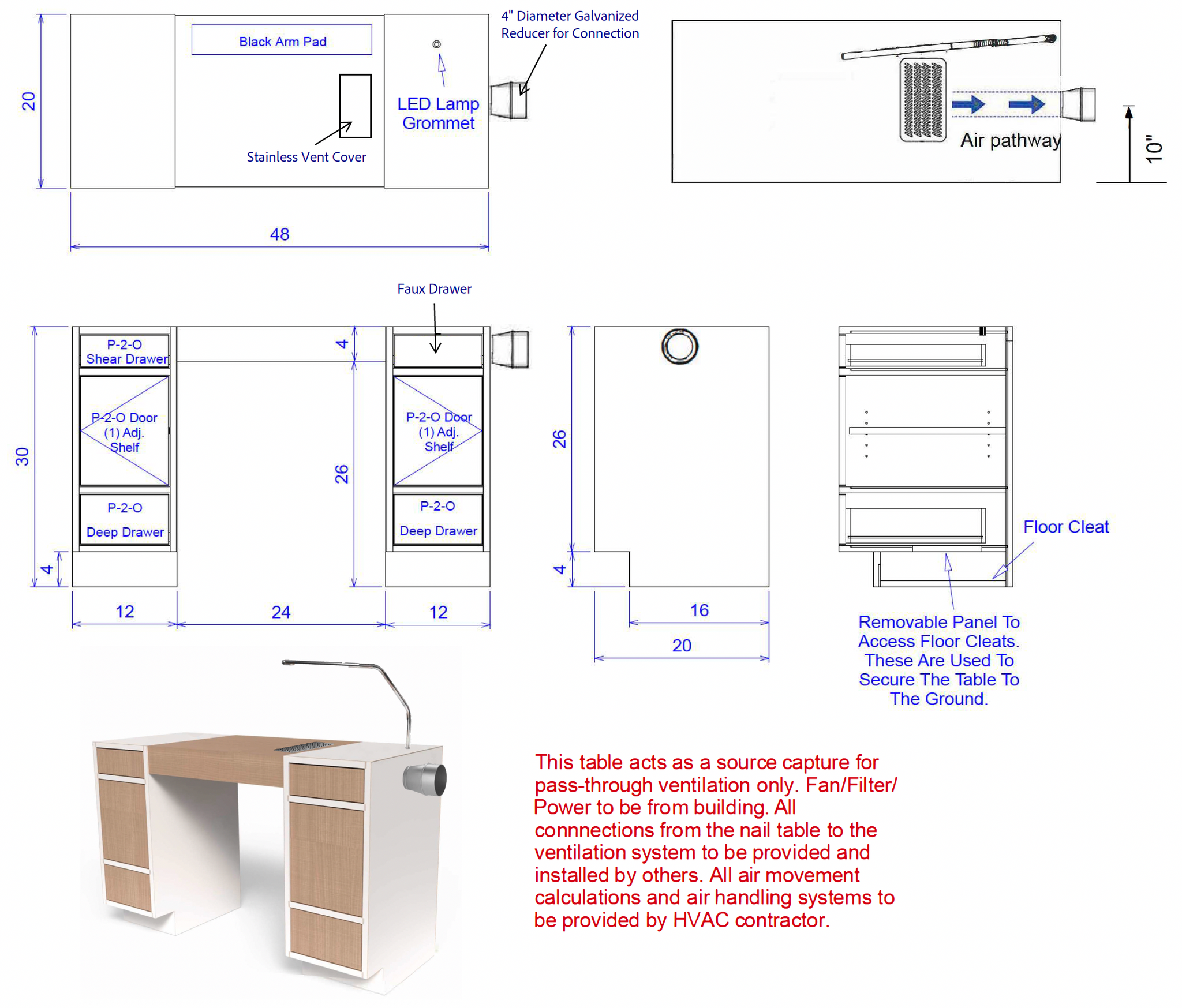 Manicure Table with (2) cabinets with doors and interiors shelf, (4) drawers, flush stretcher, Slimline LED light fixture, and upholstered manicure pad (not pictured). Cabinets & Drawers are push-to-open (PTO). Featuring built-in plenum to hook to wall mounted ventilation system (not included), this manicure table works perfectly in states that require source-capture ventilation to the outside.