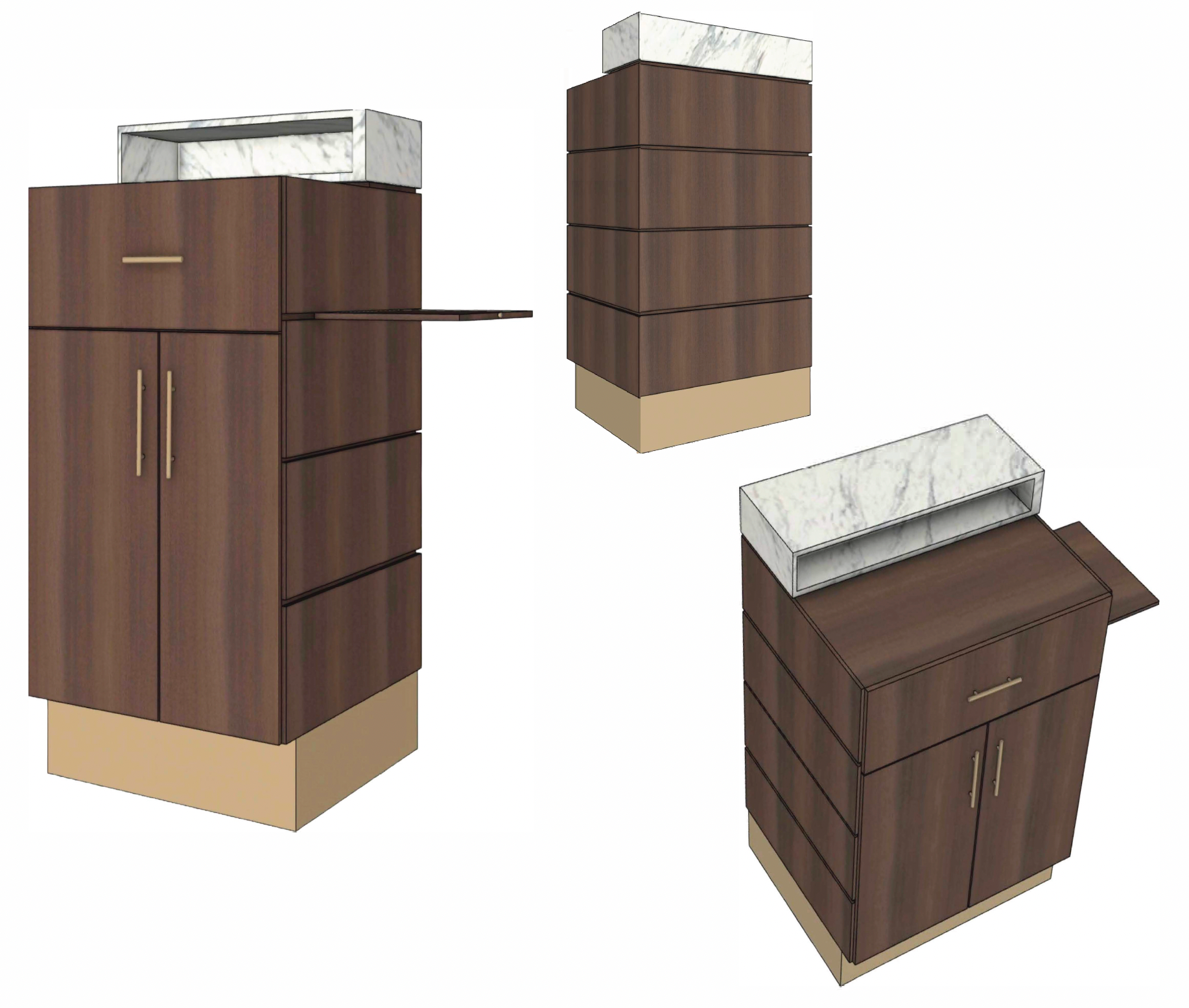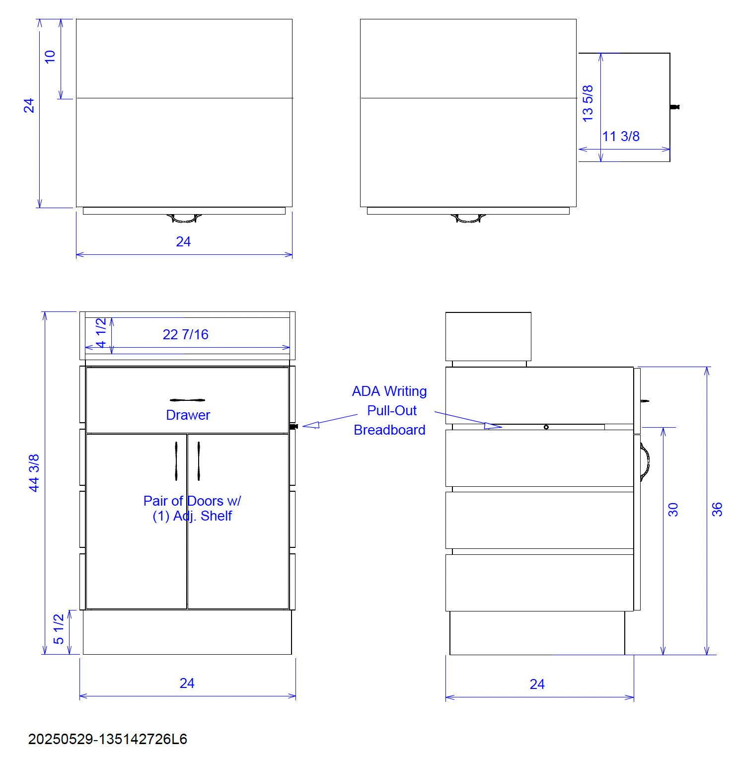 Includes one large double-door storage cabinet with adjustable shelf, one drawer, topper with open storage, and an extendable ADA client ledge. Customizable finishes as noted.
