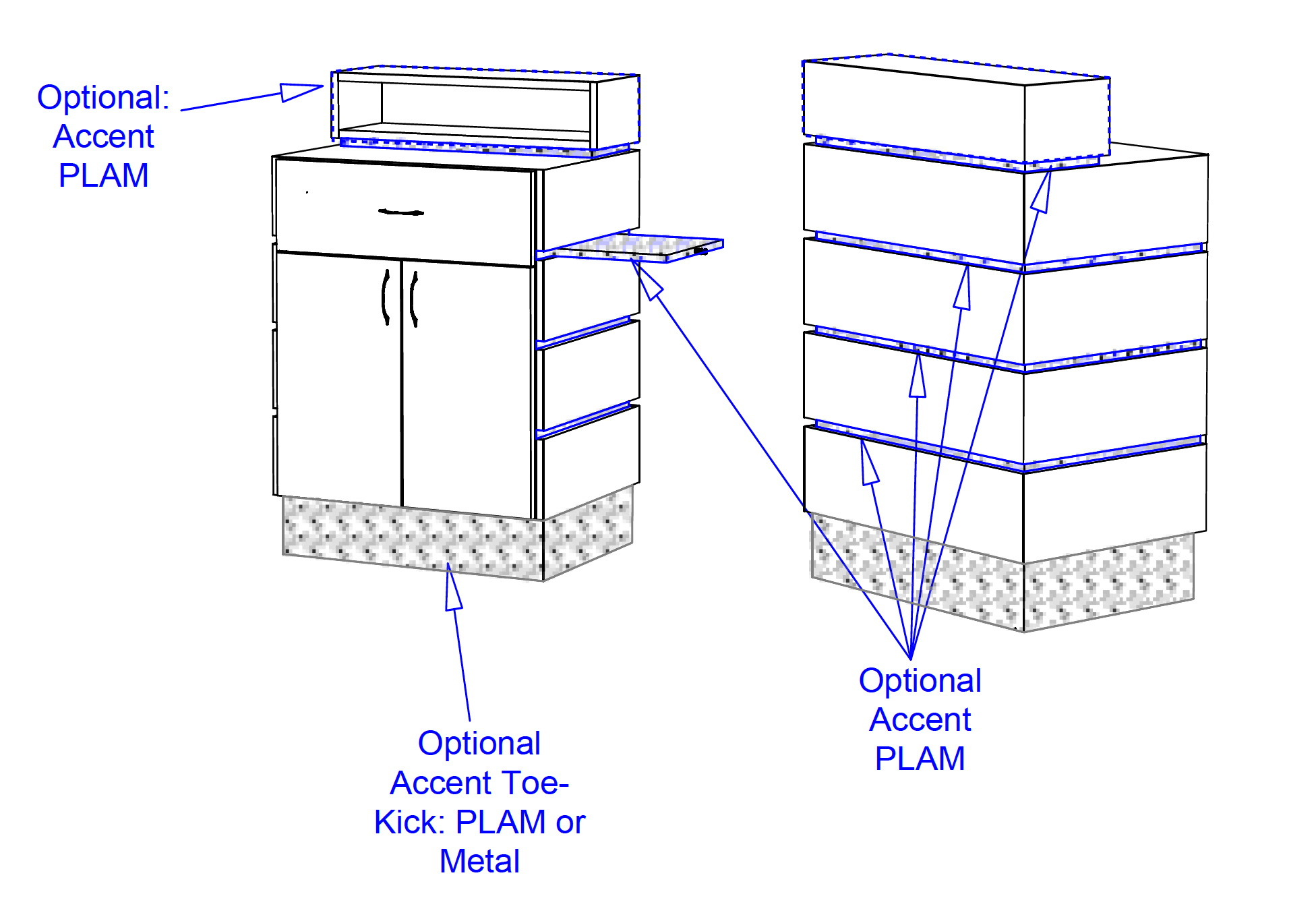 Choose from PS Exclusive Category 1 & 2 laminates. Metal Toe-Kick in Gold, Silver, or Black. Select from all hardware options.