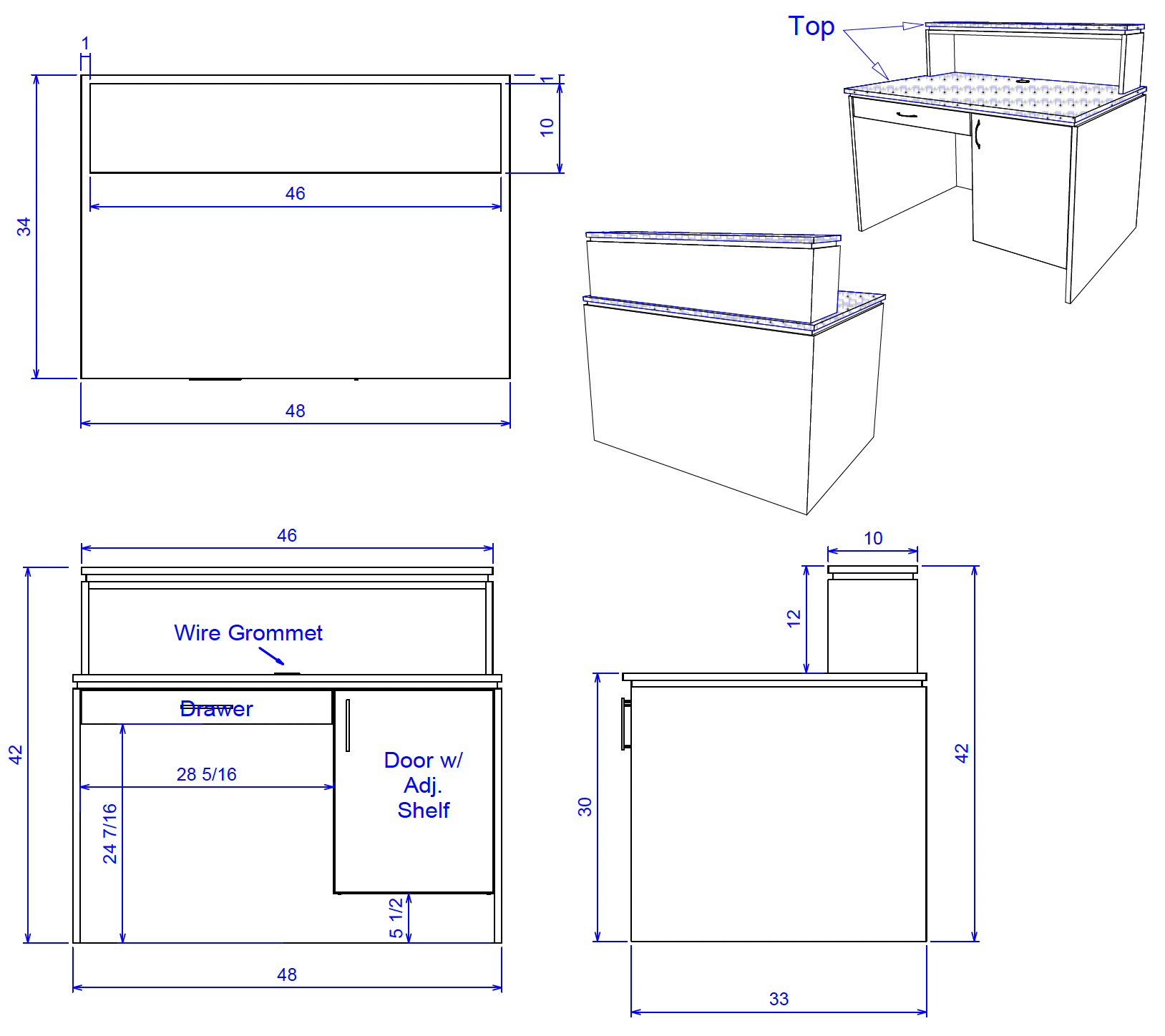 This custom, classic 48" Desk is equipped with a storage door, shelf, grommet, customer ledge, lap drawer. This covers all of the wishes for the perfect admin area!