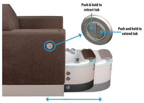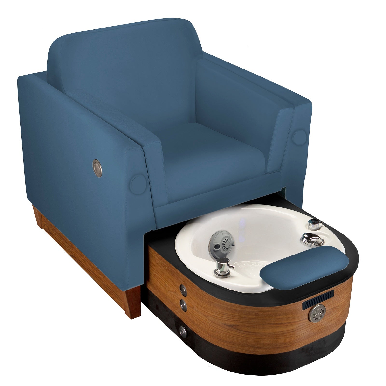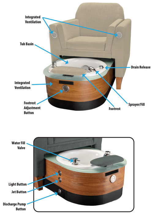 The Contemporary Retractable Pedicure Chair is a luxurious pedicure chair with a retractable, motorized, and fully plumbed pedicure bowl. The small footprint makes this an incredible space saver and the fully retractable foot bath makes entry/exit from the chair completely unobstructed. The luxurious, bespoke mid-century armchair is hand upholstered from a broad array of fabric selections and finishes. Electronic chair and bowl adjustments enable perfect client and technician ergonomics. The hidden pedicure unit features whisper quiet, reliable pipeless hydrotherapy, and is packed with practical features including a hand sprayer, power remote drain, and electronic footrest. This chair automatically includes built-in ventilation ducting for pass-through ventilation that hooks up to the building to meet current MEP ventilation codes for salons.