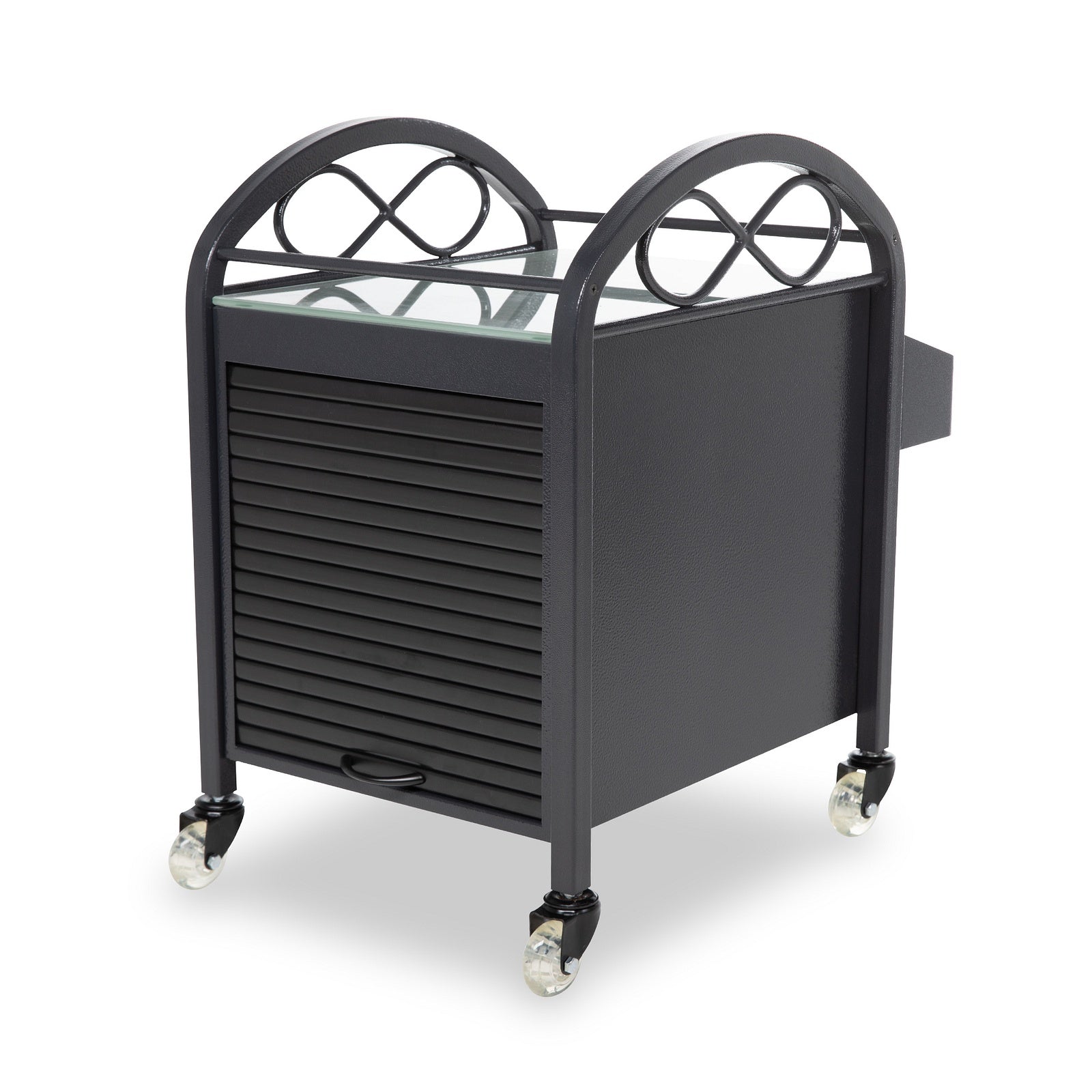 A perfectly positioned back tray holds up to three (3) 32oz bottles within arm’s reach. Top of the line rubber skate casters allow the cart to easily glide across any surface for shared use between services. Other features include: two (2) sliding drawers, sliding front panel and front/back top bar supports.