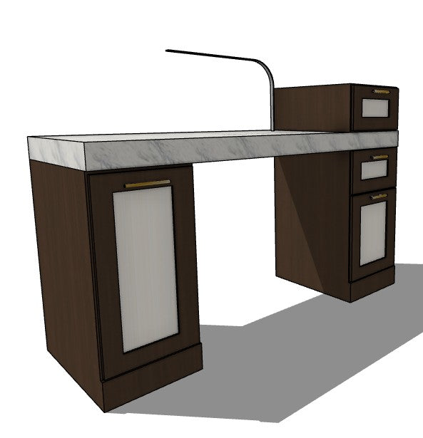 Manicure table with (1) lower cabinet with door and adjustable shelves, (1) 3" thick countertop, (1) lower cabinet with door and drawer, and (1) upper cabinet with drawer. Includes slimline LED lamp (shown; stainless steel) + upholstered manicure pad (not shown). Shaker doors and drawer fronts with contrasting laminate as shown for no extra charge.