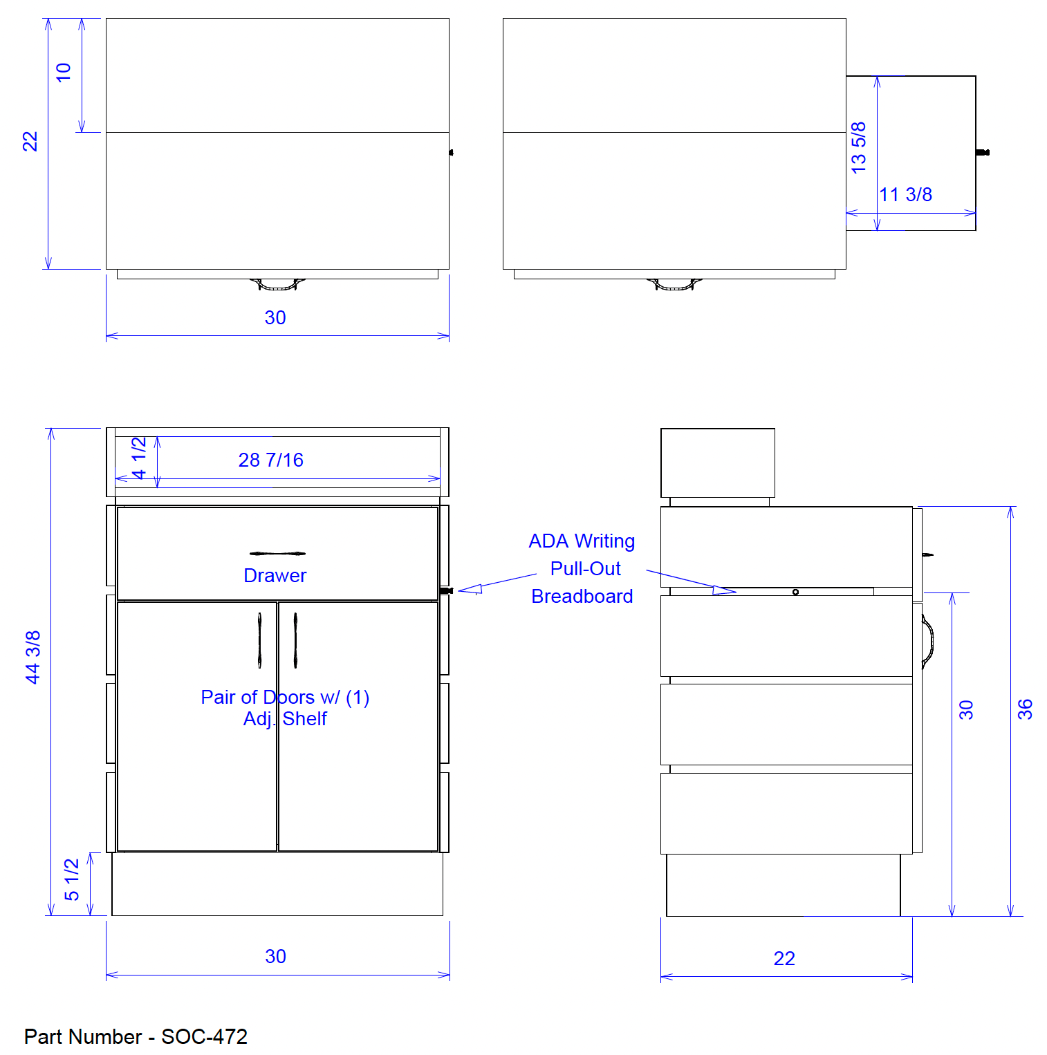 Includes one large double-door storage cabinet with adjustable shelf, one drawer, topper with open storage, and an extendable ADA client ledge. Customizable finishes as noted.