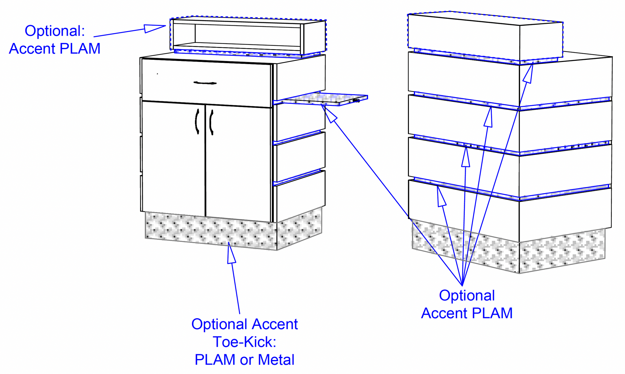 Choose from PS Exclusive Category 1 & 2 laminates. Metal Toe-Kick in Gold, Silver, or Black. Select from all hardware options.
