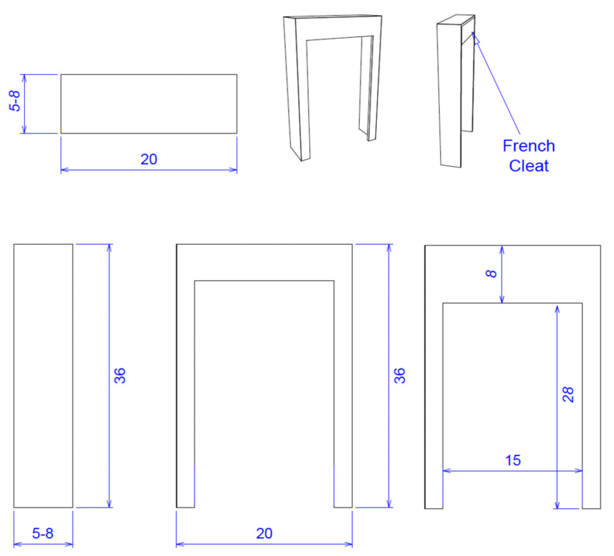 - includes: (1) U-shaped, laminated box w/8"H front panel, 2.5"W side front panel wings, an open back, and a french cleat to secure to wall.