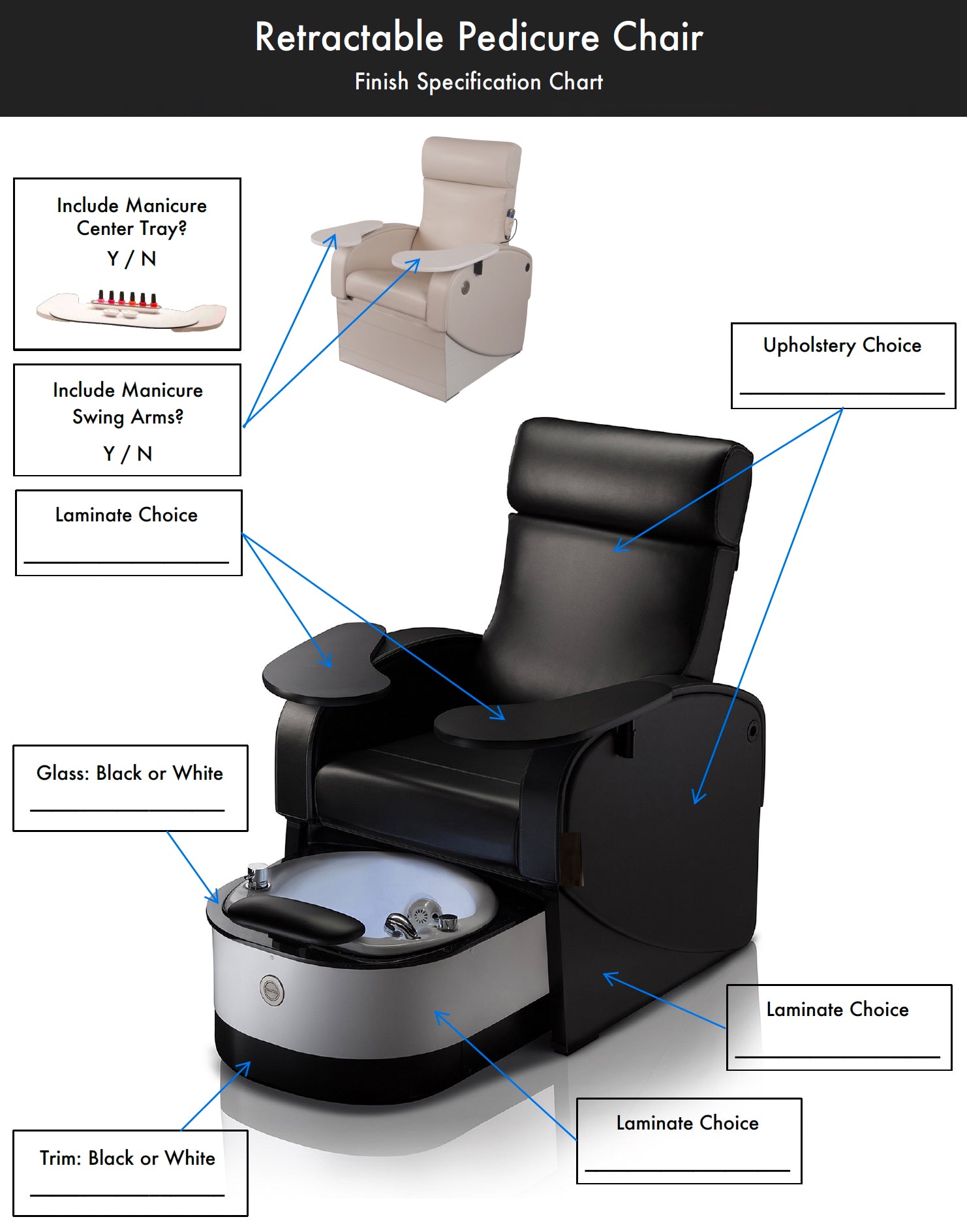Features a retractable, motorized, fully plumbed pedicure bowl. With a retracted footprint similar to that of a standard armchair, this chair is an incredible space saver, and an easy replacement for uncomfortable banquettes. Its versatility maximizes revenue through flexible scheduling for either manicures, pedicures, or express combo treatments. This luxurious, bespoke chair is hand upholstered from a broad array of fabric selections and finishes. Electronic chair, bowl and footrest adjustments enable perfect client and technician ergonomics. The hidden pedicure unit features whisper quiet, reliable pipeless hydrotherapy, and is packed with practical features including a hand sprayer, power remote drain, and convenient plumbing connects.